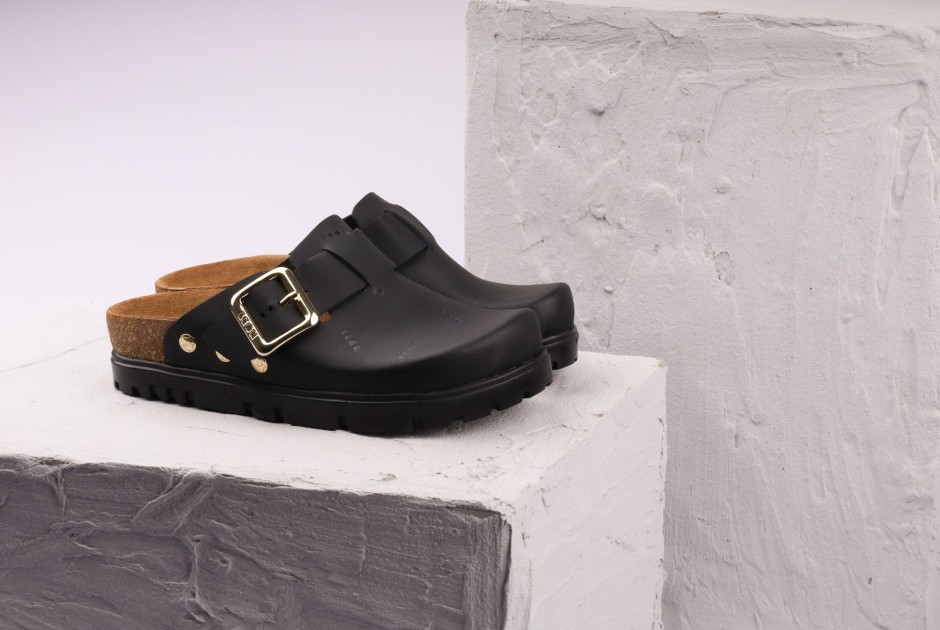 Ženska klompa izrađena od prirodne kože i kožnom tabanicom koja sadrži masažni gel. Izrađena od prirodnog materijala – koža, i poliuretanskim đonom.
