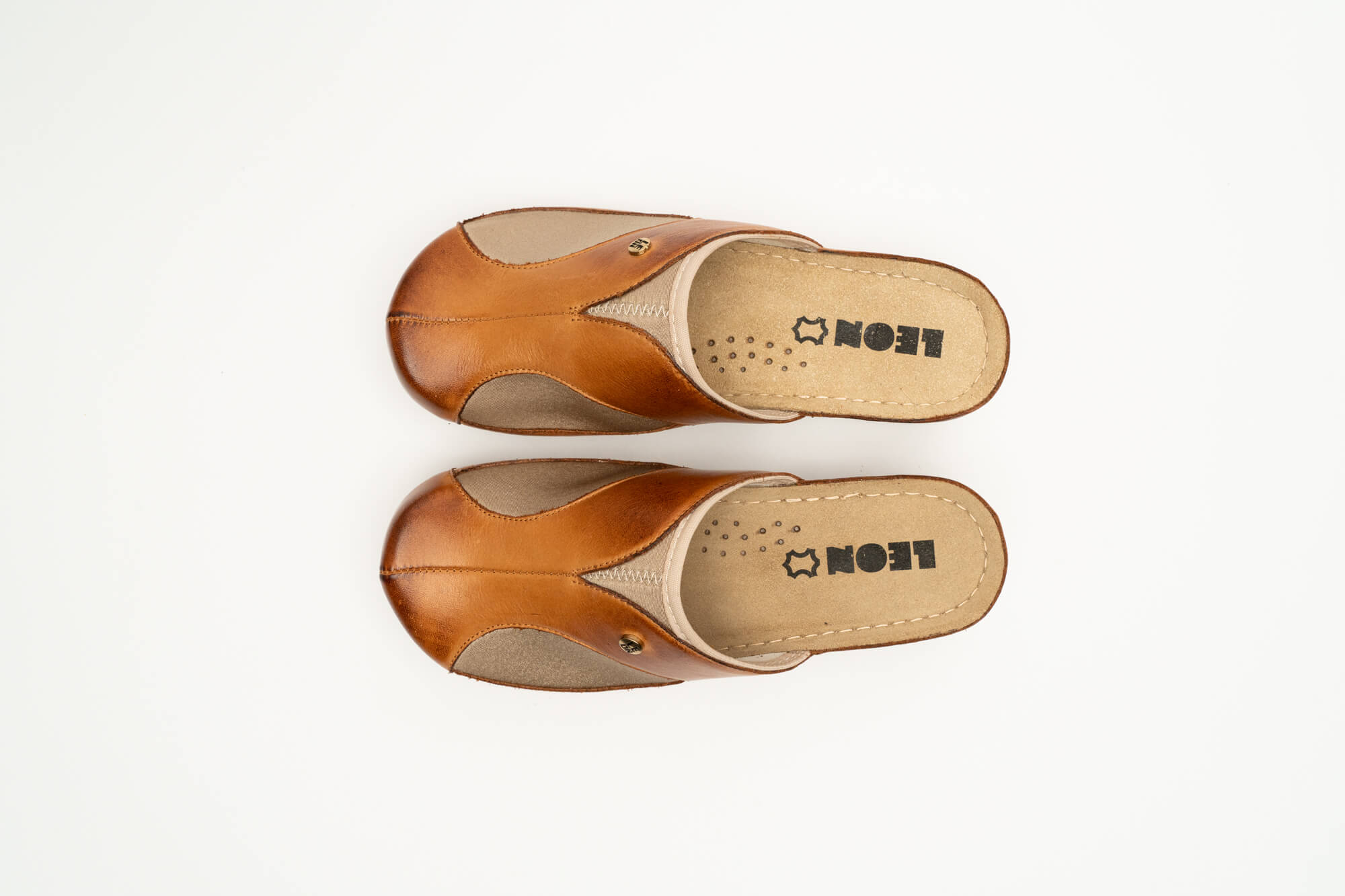Ženska papuča izrađena od prirodne kože sa elastičnim materijalom koji je pogodan za čukljeve i kožnom tabanicom koja sadrži masažni gel. Đon je naparvljen od poliuretanske mase koji sadrži anti – slip čep koji sprečava klizanje.