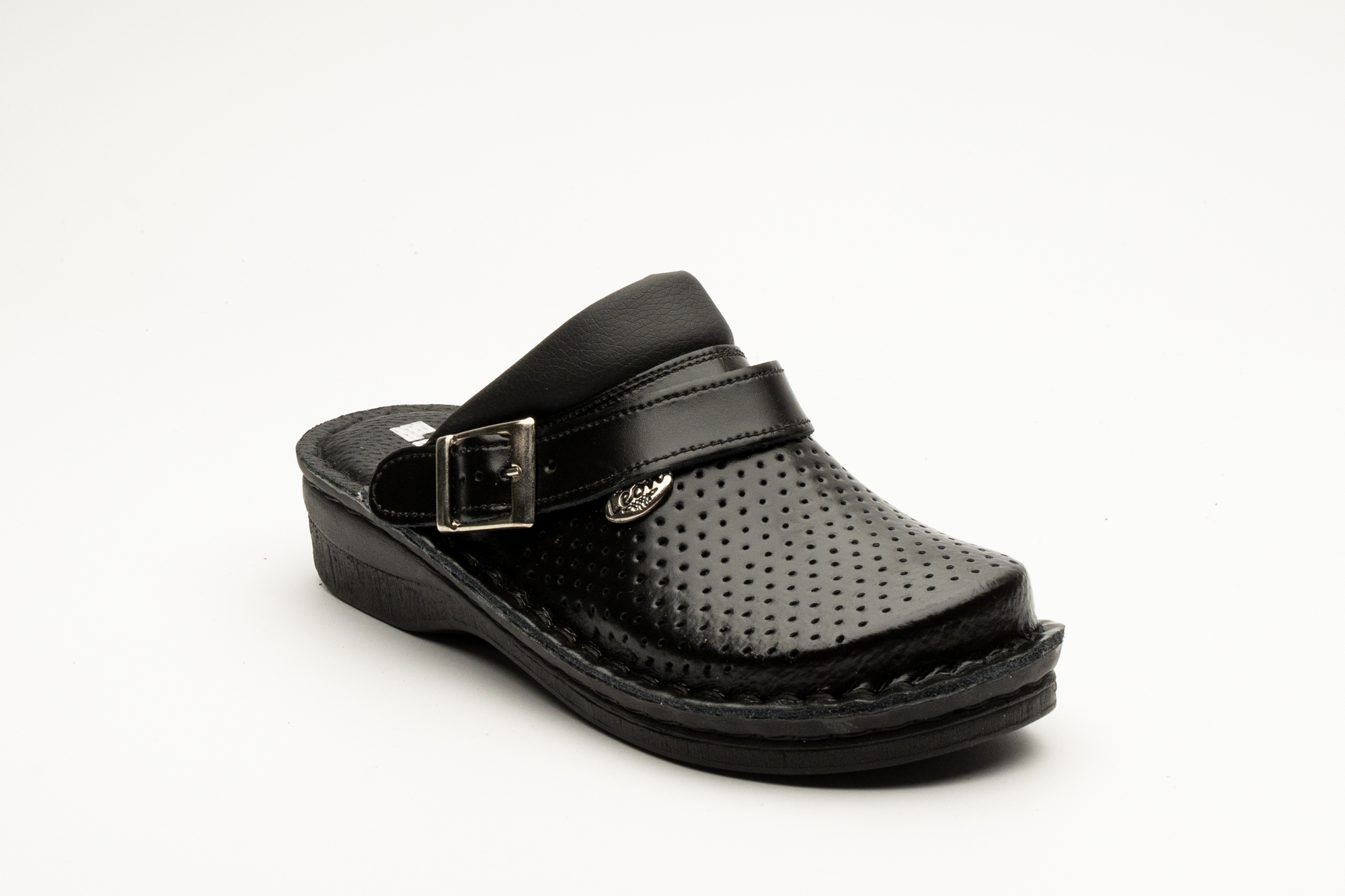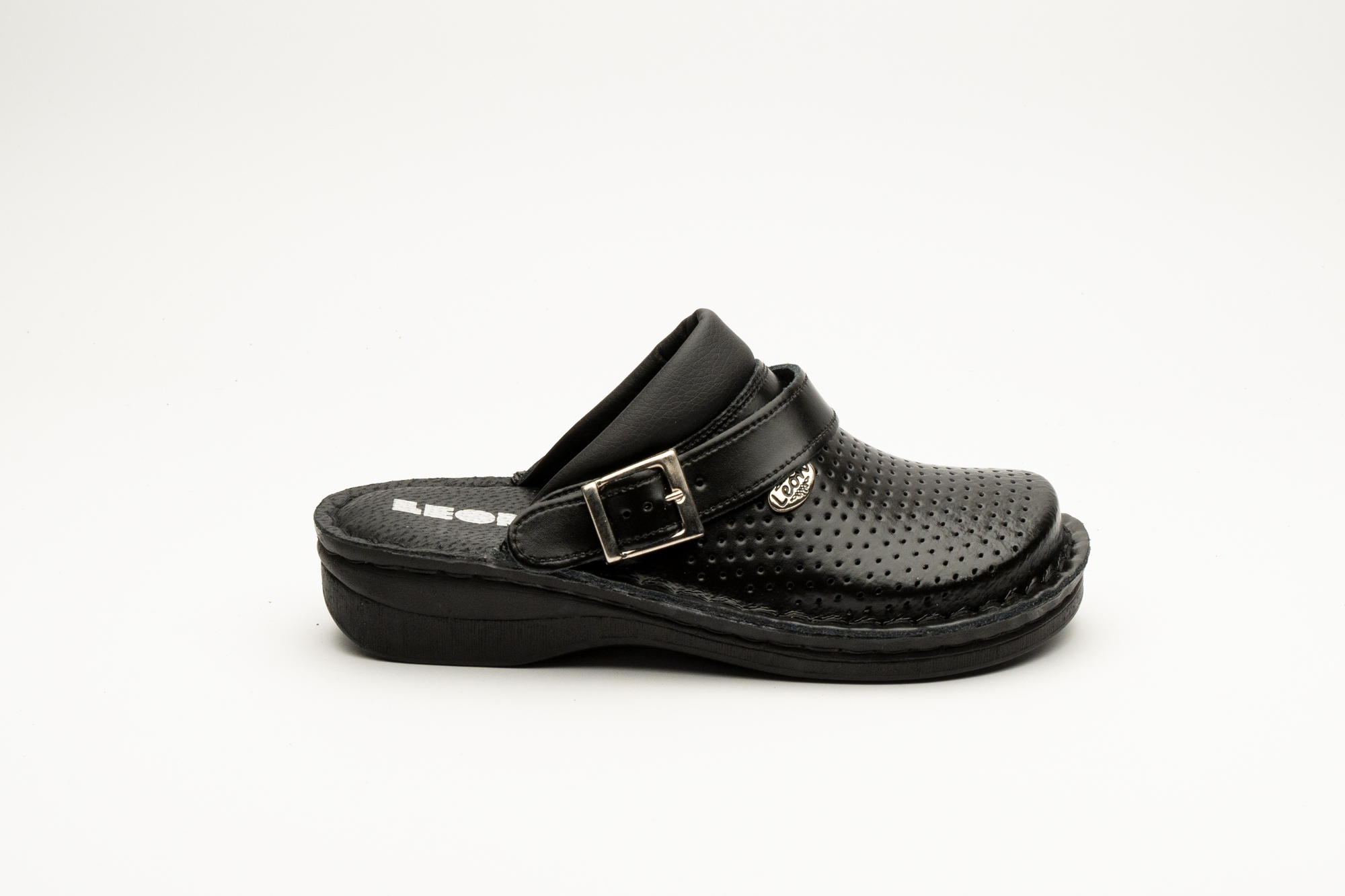 Ženska papuča izrađena od prirodne kože sa ventilirajućim rupicama i kožnom tabanicom koja sadrži masažni gel. Đon je naparvljen od poliuretanske mase koji sadrži anti – slip čep koji sprečava klizanje.