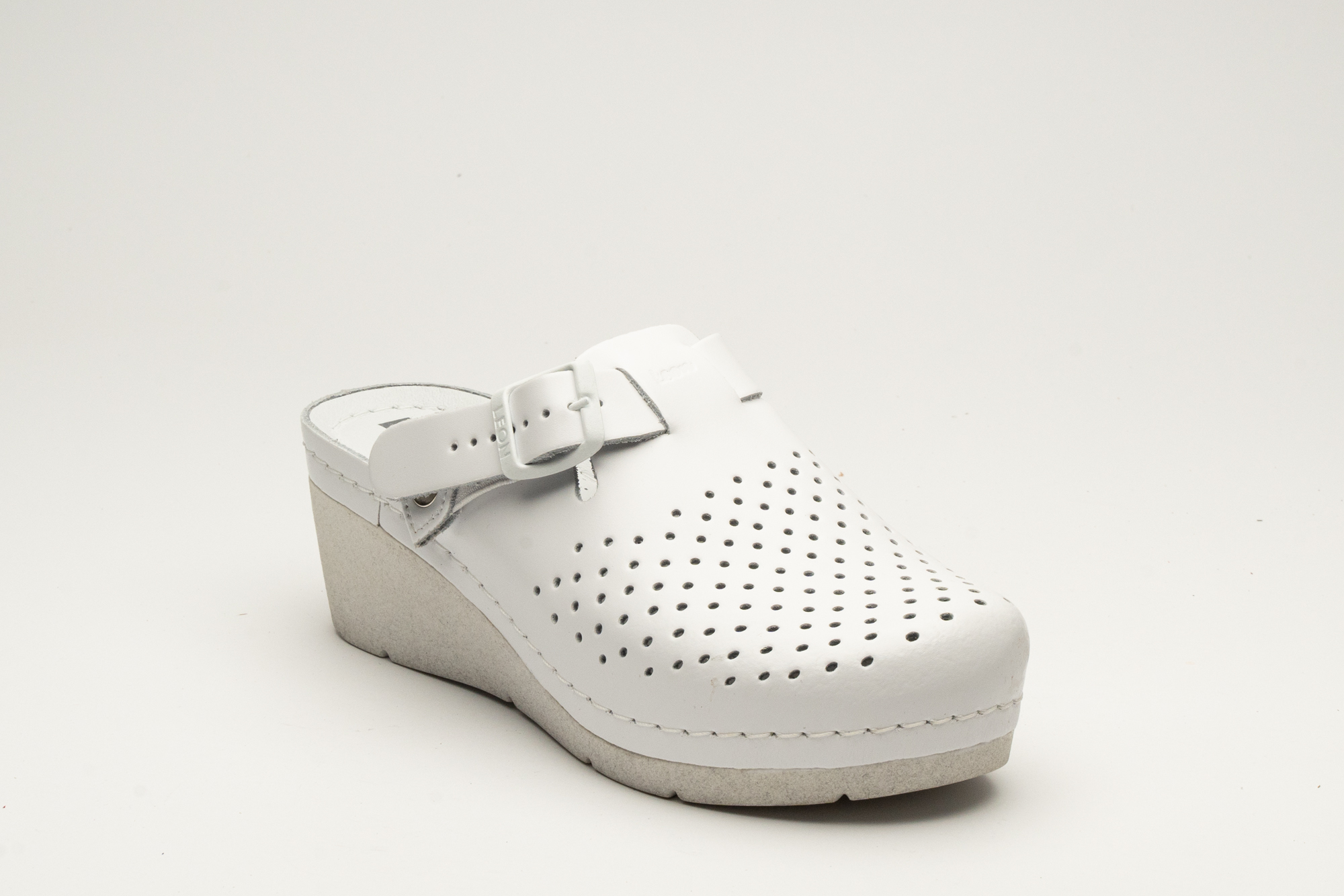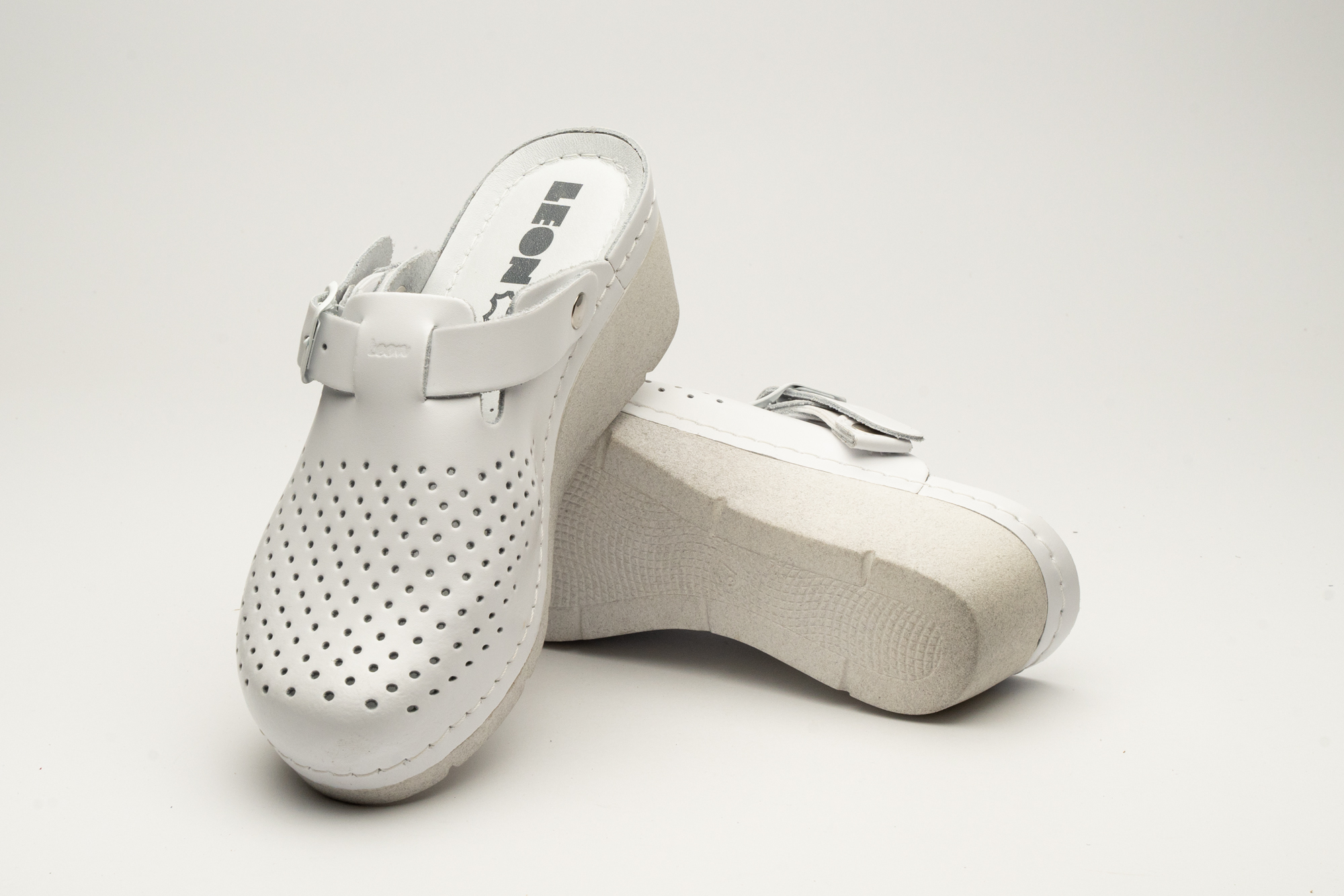 Ženska papuča izrađena od prirodne kože sa ventilirajućim rupicama i kožnom tabanicom koja sadrži masažni gel. Đon je naparvljen od poliuretanske mase.