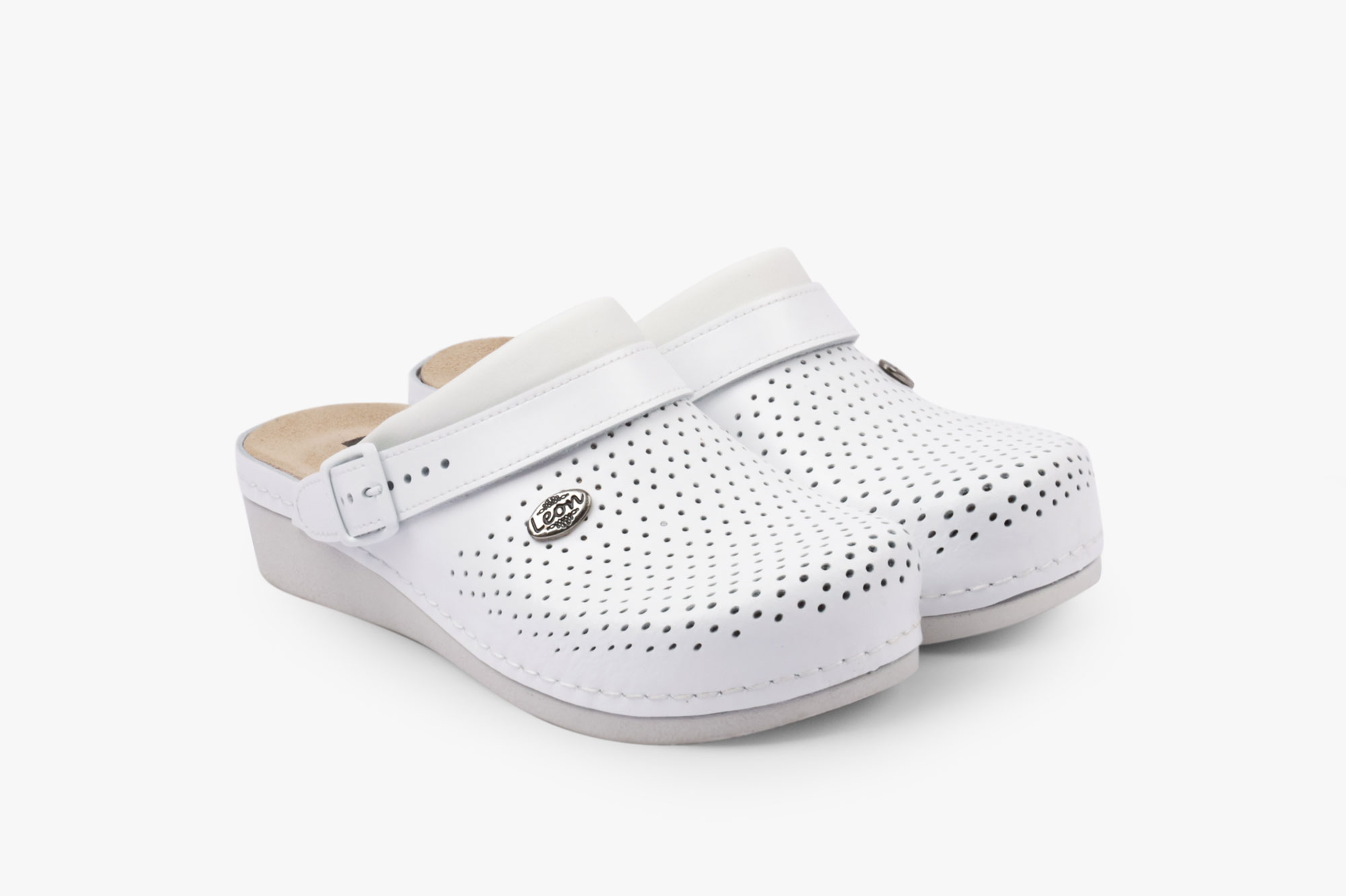 Ženska klompa izrađena od prirodne kože i kožnom tabanicom koja sadrži masažni gel. Đon je napravljen od poliuretanske mase koji sadrži anti – slip čep koji sprečava klizanje. Može da se izvadi i zameni uložak.